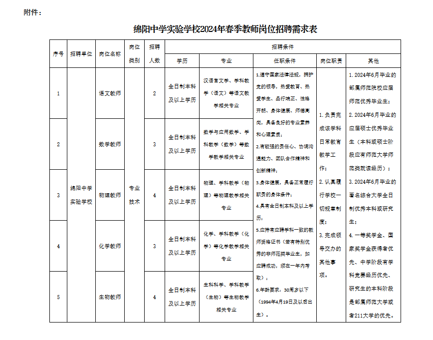 附件:《綿陽中學實驗學校2024年春季招聘教師崗位需求表》