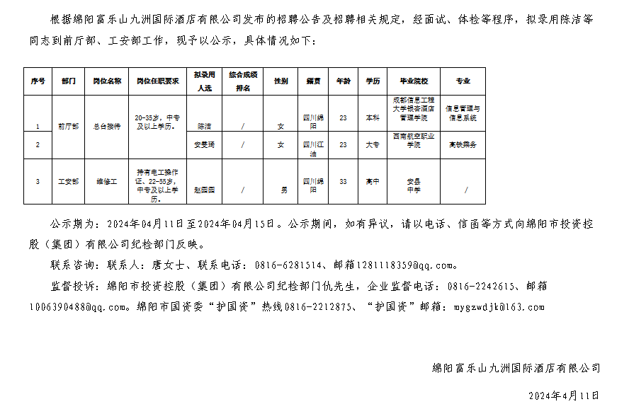 綿陽富樂山九洲國際酒店有限公司關(guān)于招聘總臺接待等一線工作崗位擬錄用人員的公示