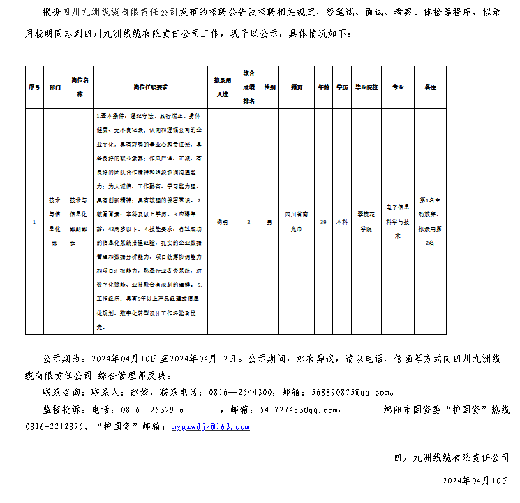 四川九洲線纜有限責任公司關(guān)于招聘技術(shù)與信息化部副部長擬錄用人員的公示