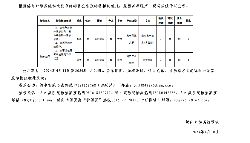 綿陽(yáng)中學(xué)實(shí)驗(yàn)學(xué)校關(guān)于招聘生活老師崗位測(cè)試成績(jī)的公示(第二批)