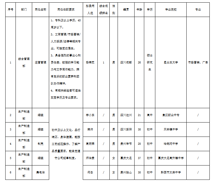 根據(jù)浙江長(zhǎng)虹飛獅電器工業(yè)有限公司發(fā)布的招聘公告及招聘相關(guān)規(guī)定,經(jīng)面試、考察、體檢等程序,擬錄用楊錦藝等6名同志到浙江長(zhǎng)虹飛獅電器工業(yè)有限公司工作,現(xiàn)予以公示,具體情況如下: