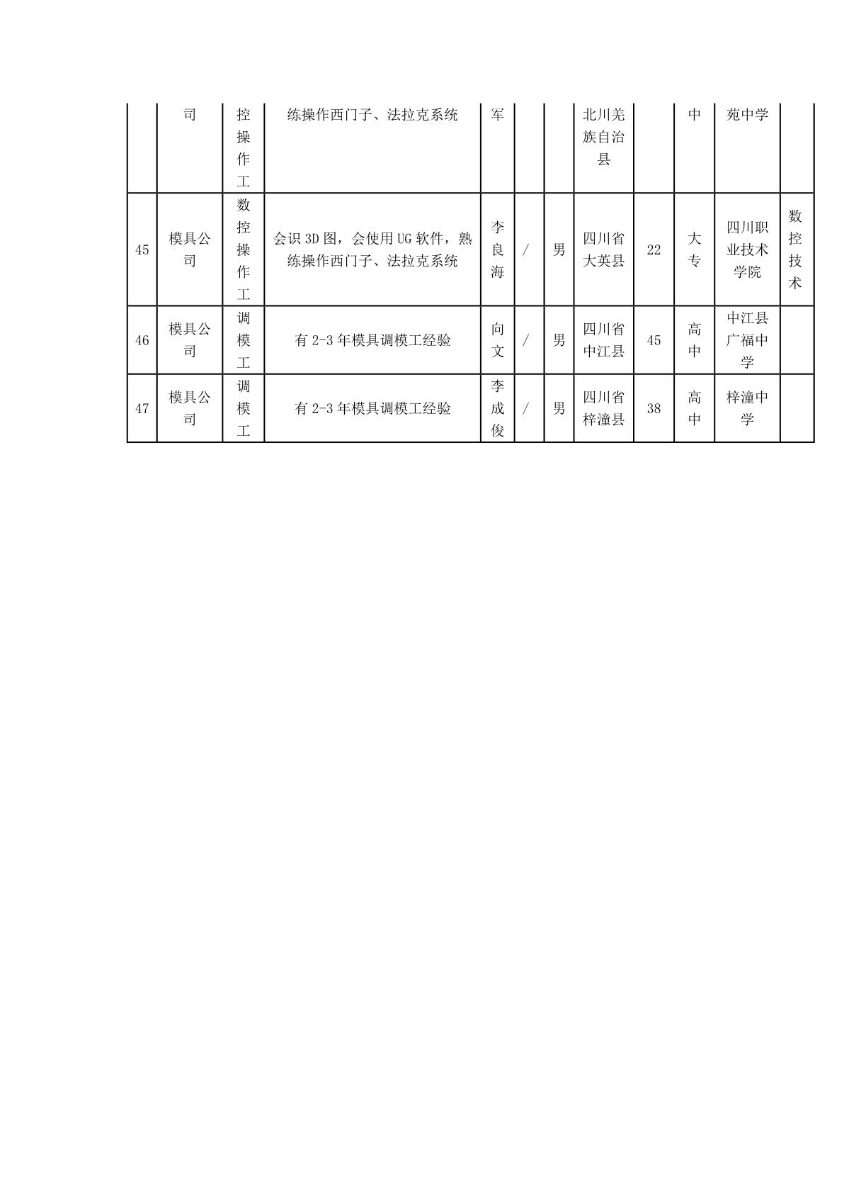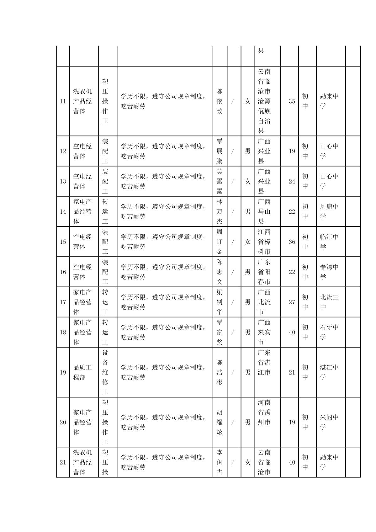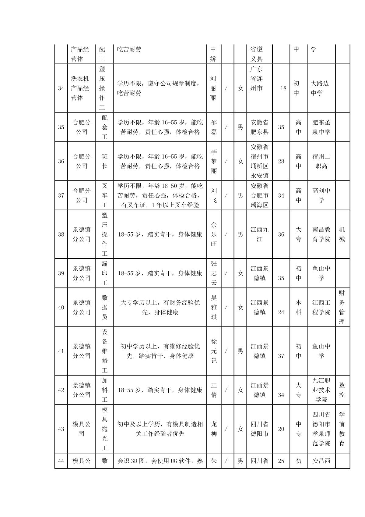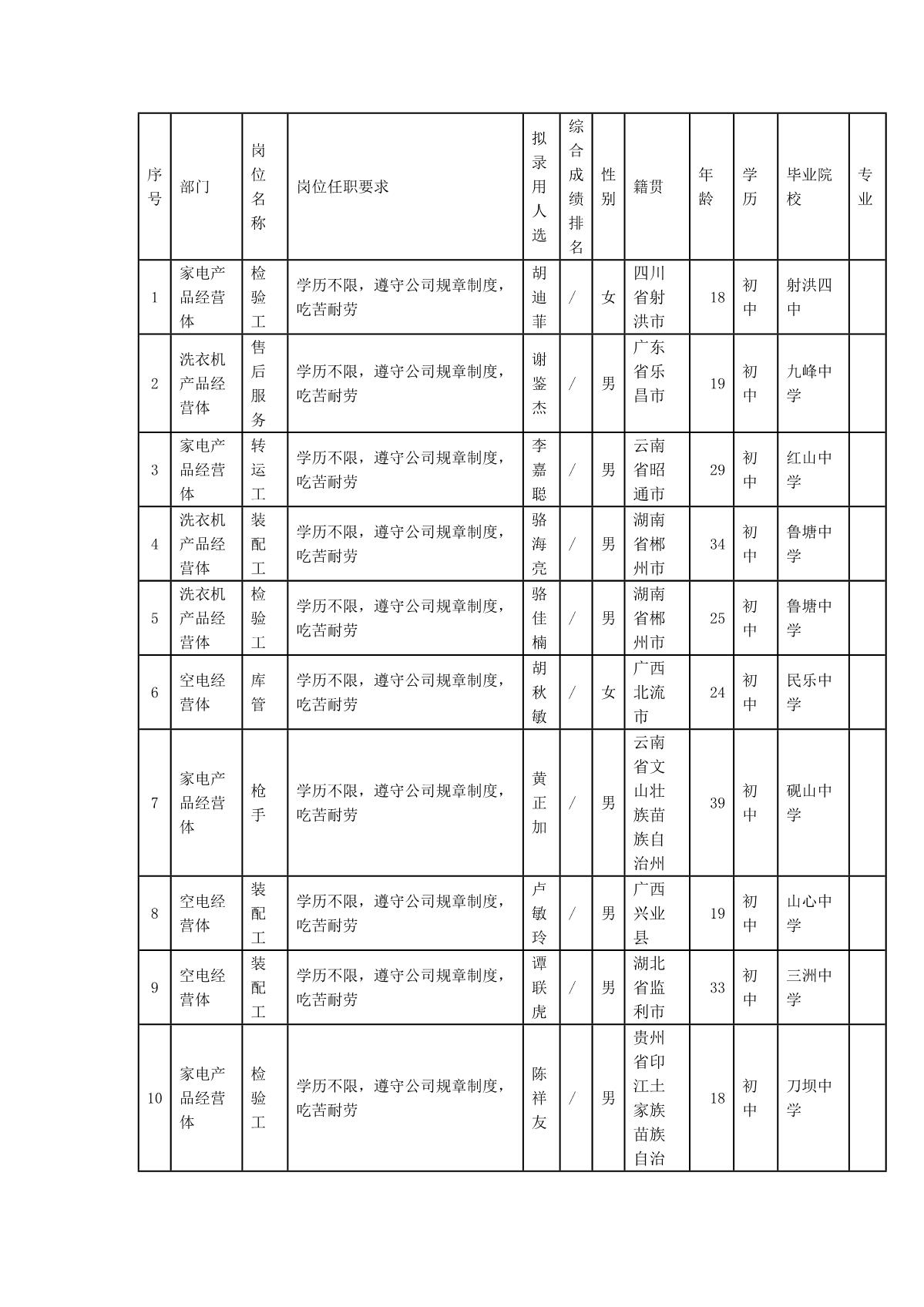 根據(jù)四川長虹模塑科技有限公司發(fā)布的招聘公告及招聘相關(guān)規(guī)定,經(jīng)筆試、面試、考察、體檢等程序,擬錄用胡迪菲等同志到模塑公司工作,現(xiàn)予以公示,具體情況如下:
