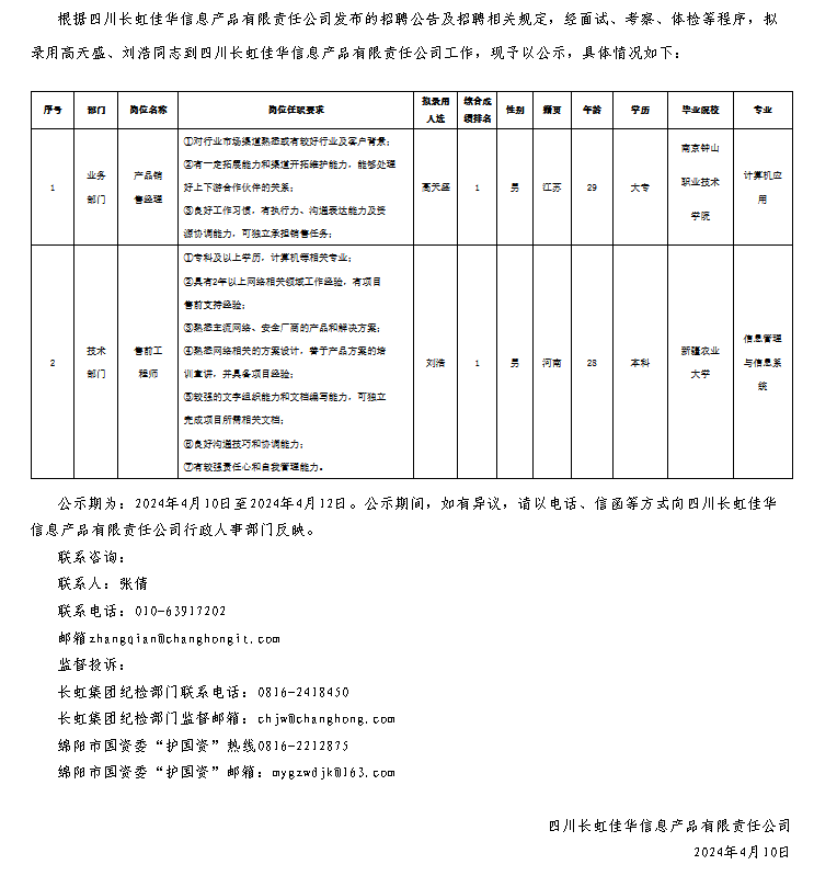 四川長虹佳華信息產品有限責任公司關于招聘產品銷售經理等崗位擬錄用人員的公示