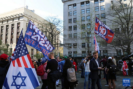 4月15日,在美國紐約,美國前總統(tǒng)特朗普的支持者在法庭前的公園舉行集會。新華社記者 劉亞南 攝