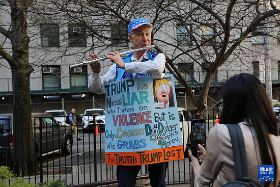 4月15日,在美國紐約,美國前總統(tǒng)特朗普的反對者在法庭前的公園掛著標語牌演奏樂器。新華社記者 劉亞南 攝