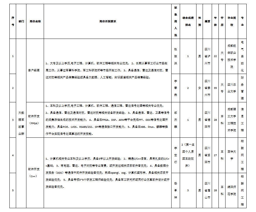 根據(jù)四川九州軟件有限公司發(fā)布的招聘公告及招聘相關(guān)規(guī)定,經(jīng)筆試、面試、考察、體檢等程序,擬錄用鄔杰麟,李世行,楊亭坤,杜勝洪,李春燕同志到四川九州軟件有限公司工作,現(xiàn)予以公示,具體情況如下: