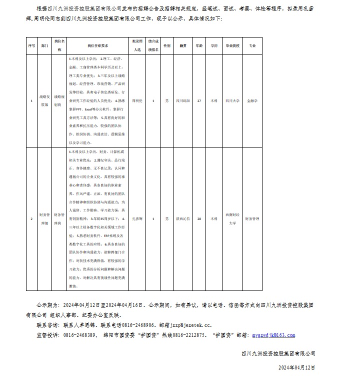 四川九洲投資控股集團有限公司關(guān)于招聘財務(wù)管理等崗位擬錄用人員的公示