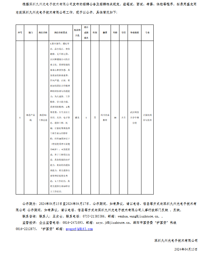 深圳九州光電子技術(shù)有限公司關(guān)于招聘海思TO工程總監(jiān)擬錄用人員的公示