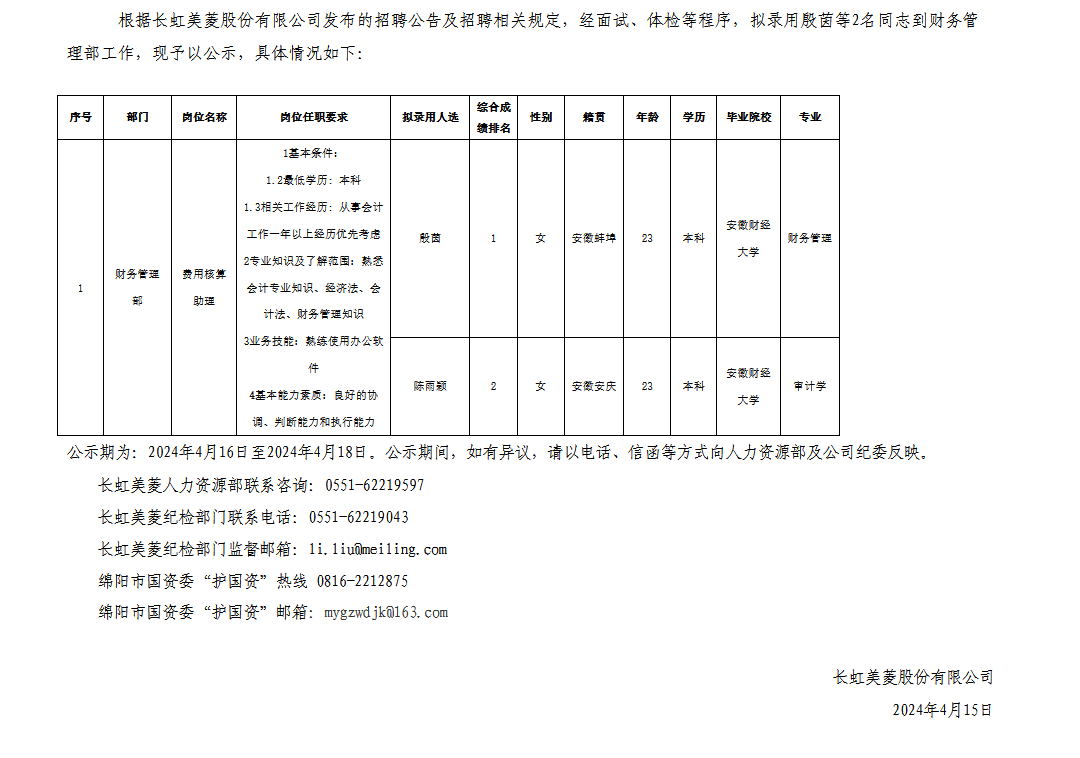 長(zhǎng)虹美菱股份有限公司關(guān)于招聘費(fèi)用核算助理擬錄用人員的公示