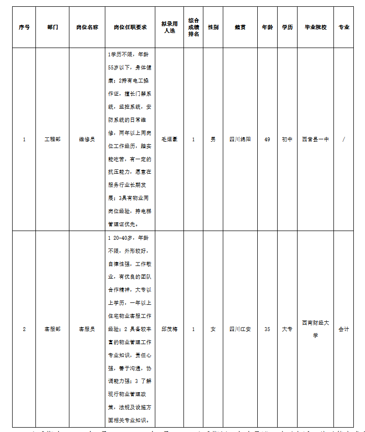根據(jù)四川長虹物業(yè)服務有限責任公司綿陽分公司發(fā)布的招聘公告及招聘相關規(guī)定,經面試、考察、體檢等程序,擬錄用毛烜亮、邱茂梅到國際城、金嶺1號管理處工作,現(xiàn)予以公示,具體情況如下: