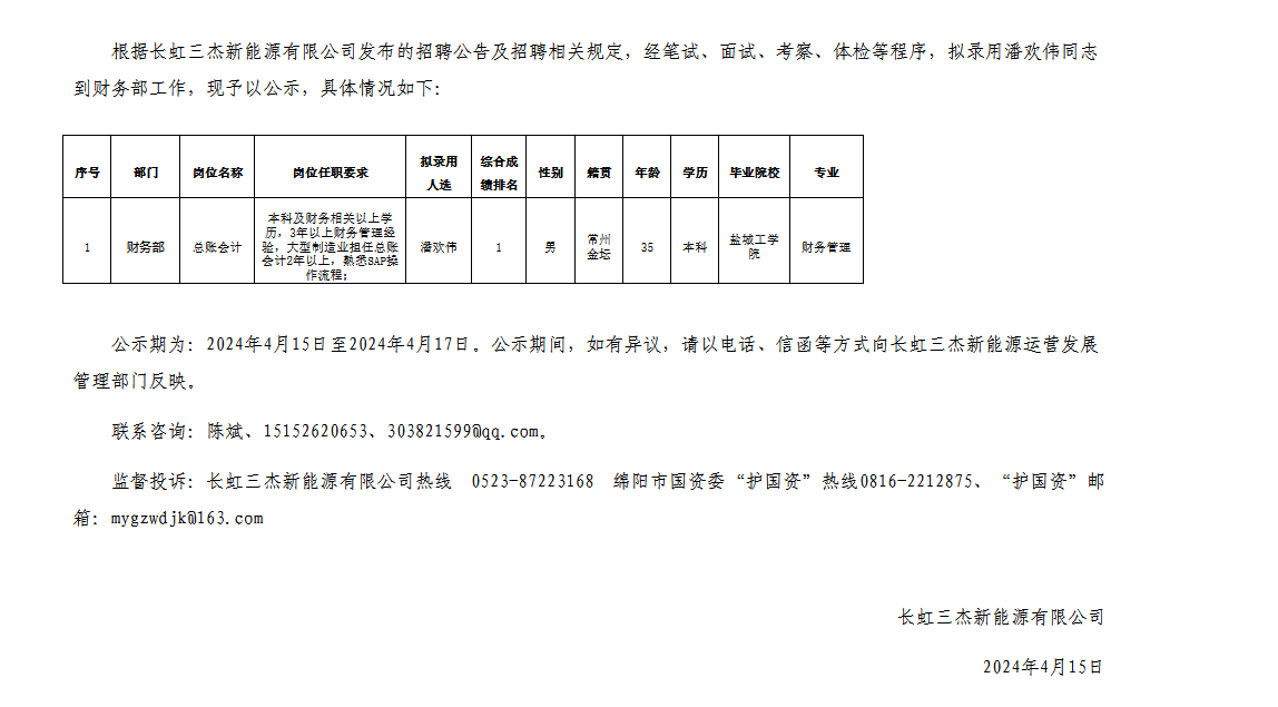 長虹三杰新能源有限公司關(guān)于招聘總賬會計(jì)崗位擬錄用人員的公示
