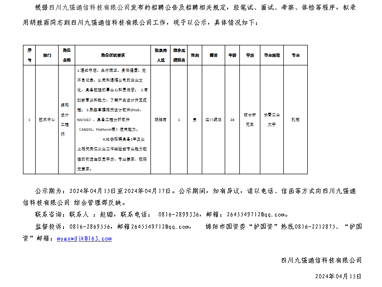 四川九強(qiáng)通信科技有限公司關(guān)于招聘結(jié)構(gòu)設(shè)計(jì)工程師擬錄用人員的公示