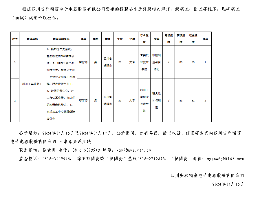 四川安和精密電子電器股份有限公司關(guān)于招聘機(jī)加工助理工程師測(cè)試成績(jī)的公示