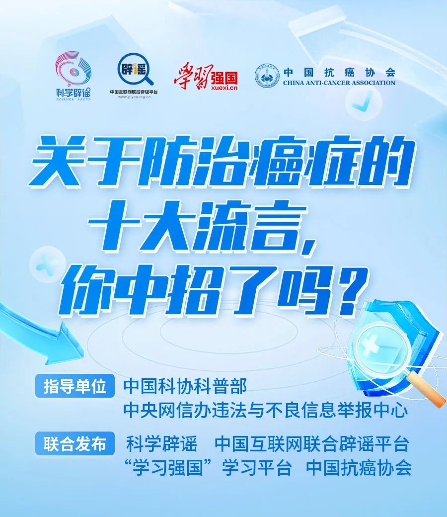 今天,科學辟謠聯(lián)合中國互聯(lián)網聯(lián)合辟謠平臺、“學習強國”學習平臺、中國抗癌協(xié)會,針對10個廣為流傳的有關“防治癌癥”的流言進行解讀,快看看你中招了沒?