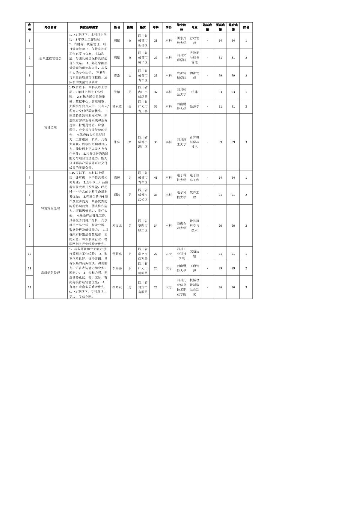 根據(jù)成都衛(wèi)通信息技術(shù)有限公司發(fā)布的招聘公告及招聘相關規(guī)定,經(jīng)筆試、面試等程序,現(xiàn)將筆試(面試)成績予以公示。