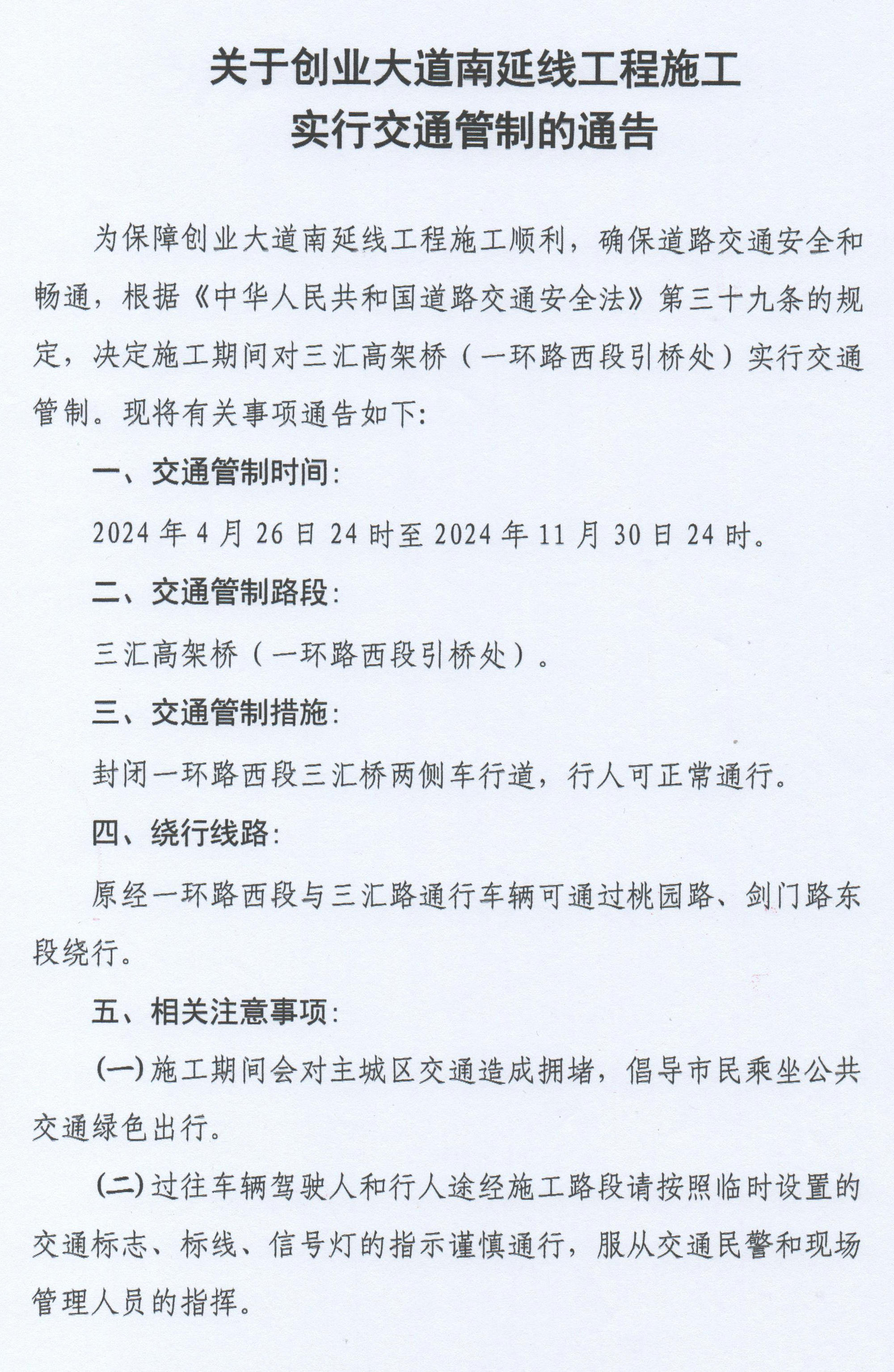 為保障創(chuàng)業(yè)大道南延線工程施工順利,確保道路交通安全和暢通,根據(jù)《中華人民共和國(guó)道路交通安全法》第三十九條的規(guī)定,決定施工期間對(duì)三匯高架橋(一環(huán)路西段引橋處)實(shí)行交通管制?,F(xiàn)將有關(guān)事項(xiàng)通告如下: