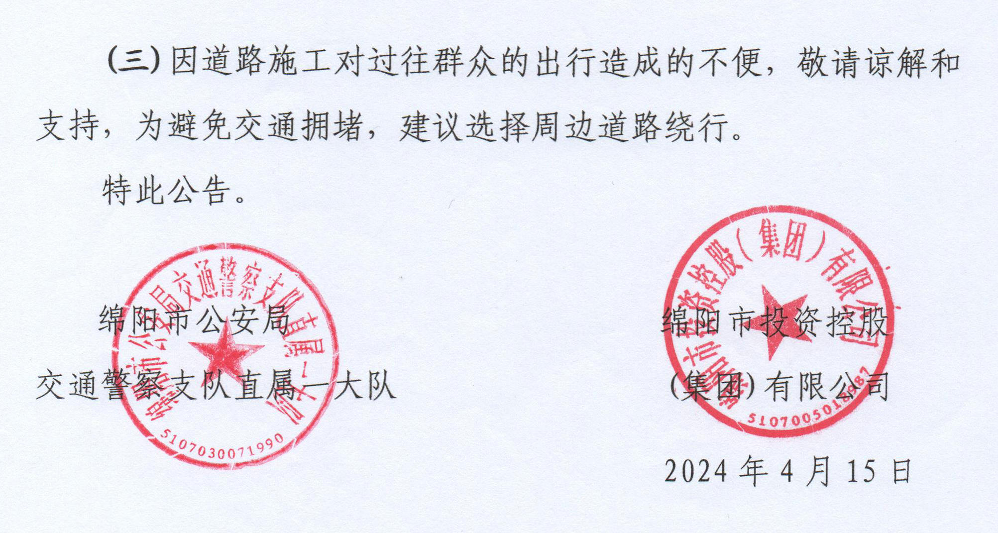 (三)因道路施工對(duì)過往群眾的出行造成的不便,敬請(qǐng)諒解和支持,為避免交通擁堵,建議選擇周邊道路繞行。