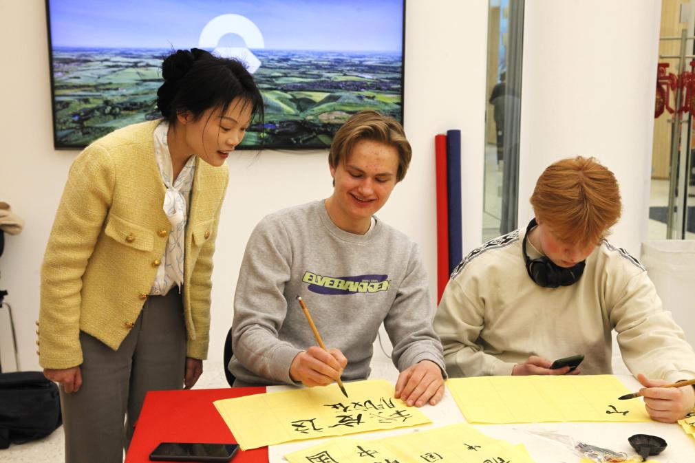4月20日,在挪威首都奧斯陸,當(dāng)?shù)孛癖娫谥形娜諔c?;顒?dòng)上體驗(yàn)書法。新華社記者 張玉亮 攝