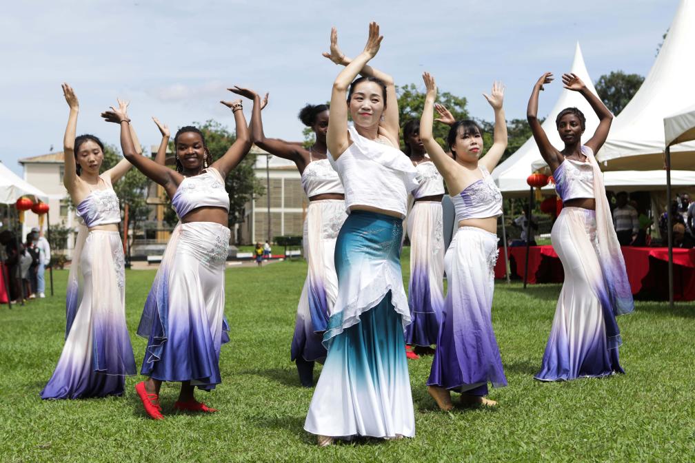 4月20日,在烏干達(dá)坎帕拉,中文師生在麥克雷雷大學(xué)舉行的中文日慶?;顒?dòng)上表演中國舞蹈節(jié)目。新華社發(fā)(阿佳拉·納瓦達(dá)攝)