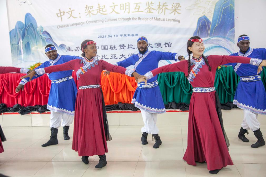 4月19日,在位于盧薩卡的贊比亞大學(xué)孔子學(xué)院,學(xué)生在中文日活動(dòng)上表演舞蹈。新華社發(fā)(馬丁·姆班圭塔攝)