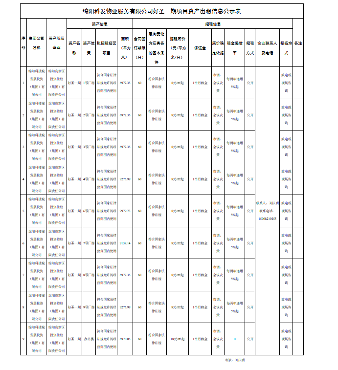 綿陽科發(fā)物業(yè)服務有限公司好圣一期項目資產出租信息公示表