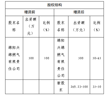 綿陽能投置業(yè)有限公司增資擴股項目已由綿陽燃氣集團有限公司董事會審議通過,現(xiàn)將增資擴股事項公告如下: