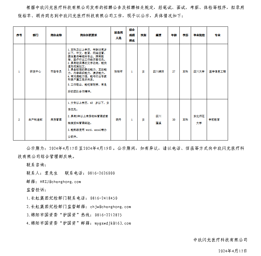 中玖閃光醫(yī)療科技有限公司關(guān)于招聘市場(chǎng)專(zhuān)員等崗位擬錄用人員的公示