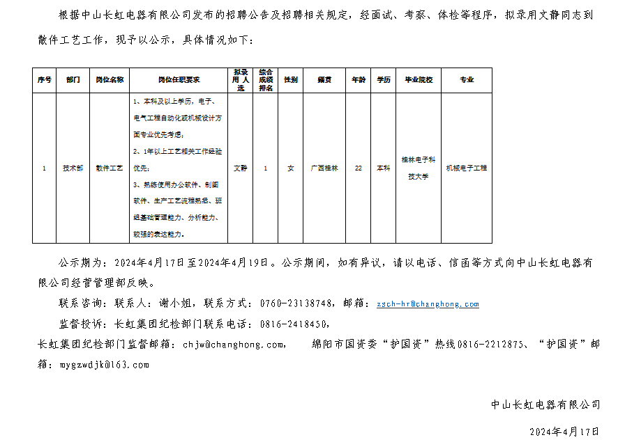 中山長(zhǎng)虹電器有限公司關(guān)于招聘散件工藝崗位擬錄用人員的公示