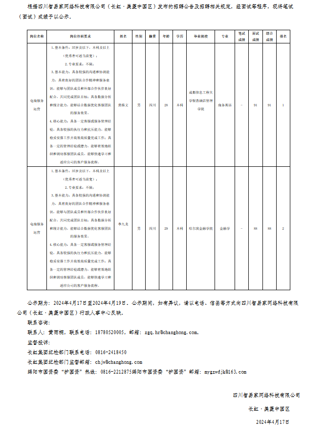 四川智易家網(wǎng)絡科技有限公司關于招聘電商服務運營崗位測試成績的公示