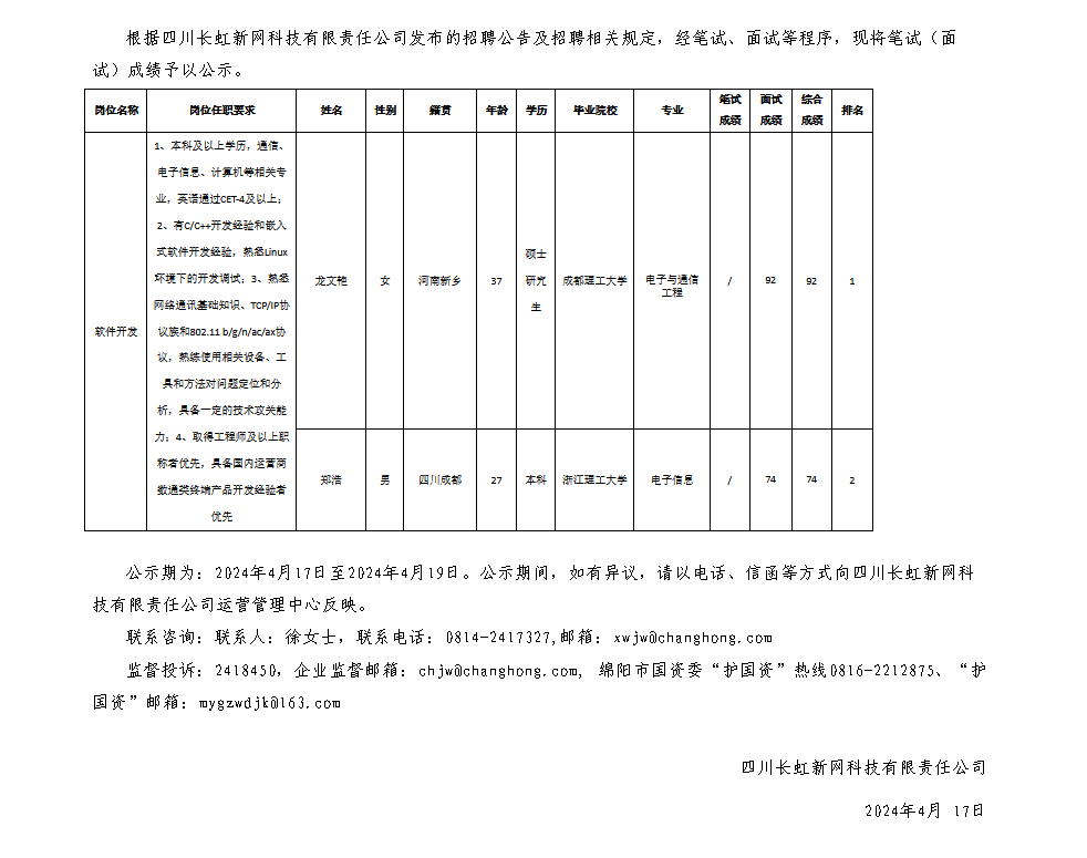 四川長虹新網(wǎng)科技有限責任公司關(guān)于招聘軟件開發(fā)崗位測試成績的公示