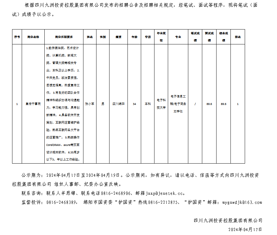 四川九洲投資控股集團(tuán)有限公司關(guān)于招聘宣傳干事崗測(cè)試成績(jī)的公示