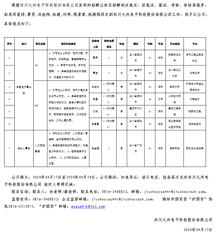 四川九州電子科技股份有限公司關(guān)于招聘QE等崗位擬錄用人員的公示