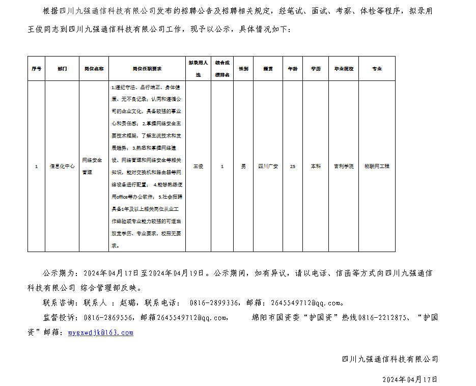 四川九強(qiáng)通信科技有限公司關(guān)于招聘網(wǎng)絡(luò)安全管理崗擬錄用人員的公示