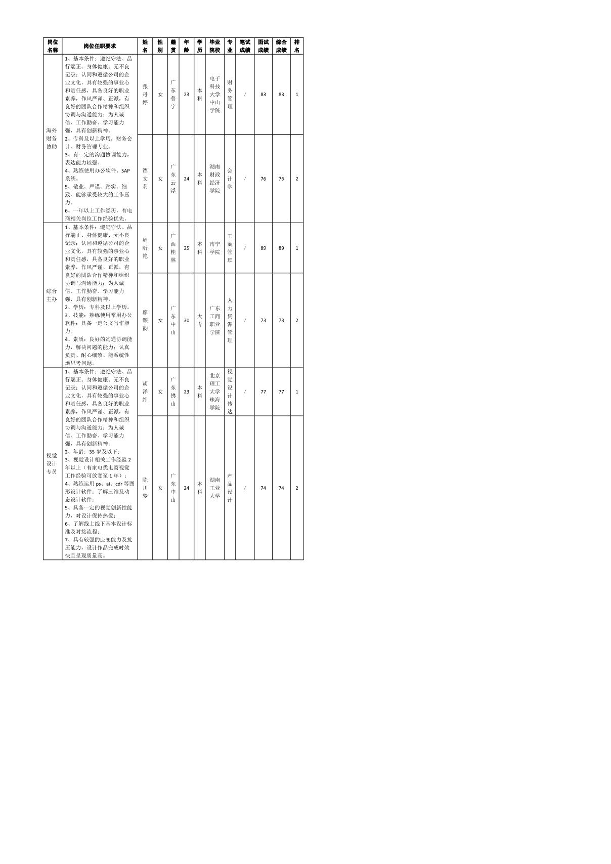 根據(jù)長(zhǎng)虹·美菱國(guó)際區(qū)品牌運(yùn)營(yíng)中心發(fā)布的招聘公告及招聘相關(guān)規(guī)定,經(jīng)面試等程序,現(xiàn)將測(cè)試成績(jī)予以公示。