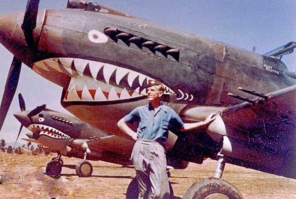 這是在二戰(zhàn)時期的昆明巫家壩機場,一名“飛虎隊”隊員在涂裝有“鯊魚嘴”標志的戰(zhàn)斗機前留影的資料照片。新華社發(fā)