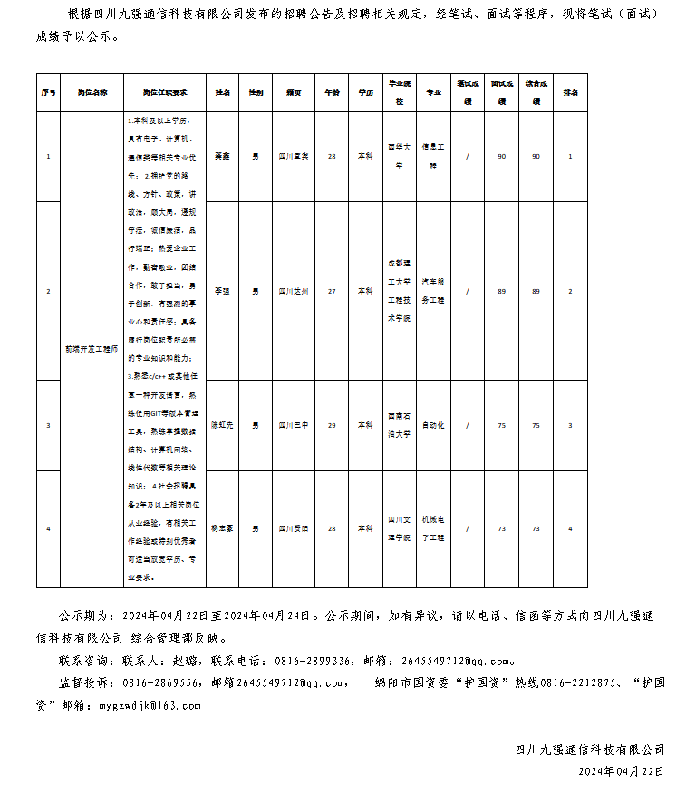 四川九強(qiáng)通信科技有限公司關(guān)于招聘前端開發(fā)工程師測試成績的公示