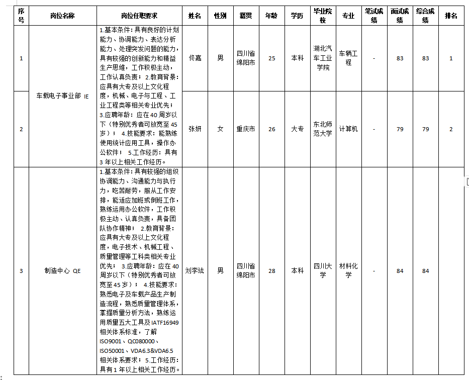 根據(jù)四川九州電子科技股份有限公司發(fā)布的招聘公告及招聘相關規(guī)定,經(jīng)筆試、面試等程序,現(xiàn)將筆試(面試)成績予以公示。