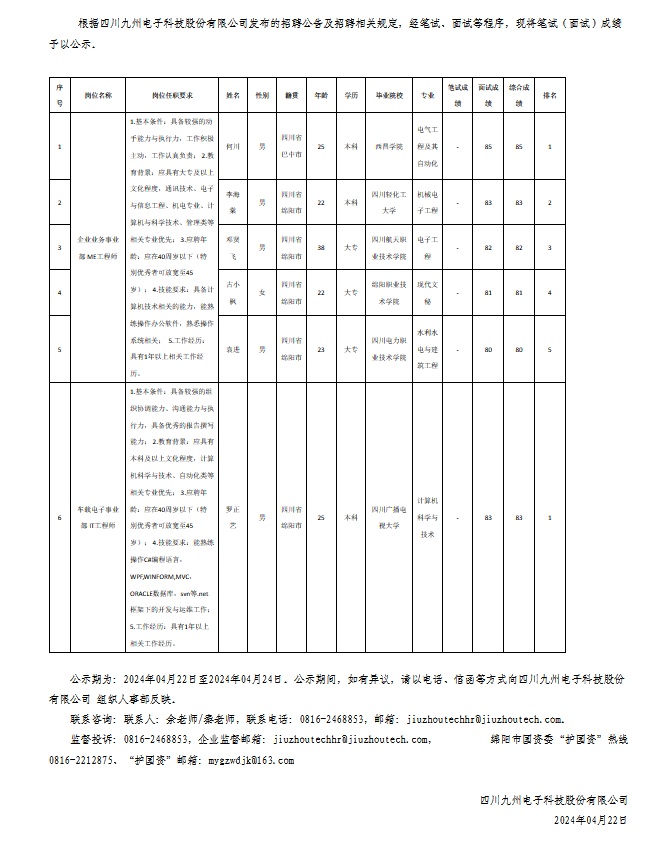 四川九州電子科技股份有限公司關(guān)于招聘IT工程師等崗位測試成績的公示