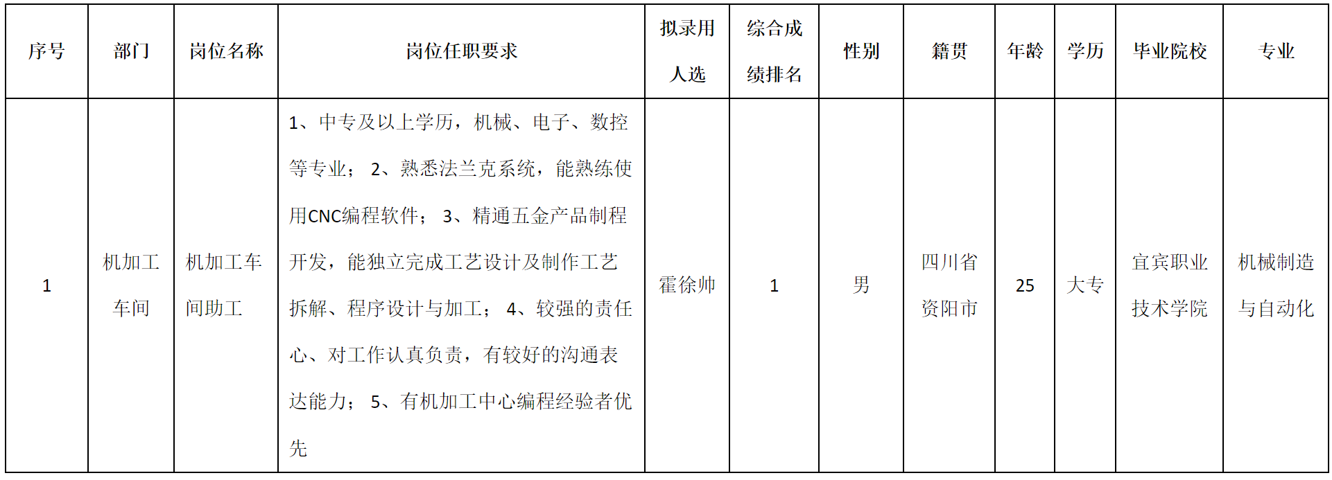 根據四川安和精密電子電器股份有限公司發(fā)布的招聘公告及招聘相關規(guī)定,經筆試、面試、考察、體檢等程序,擬錄用霍徐帥同志到四川安和精密電子電器股份有限公司工作,現予以公示,具體情況如下