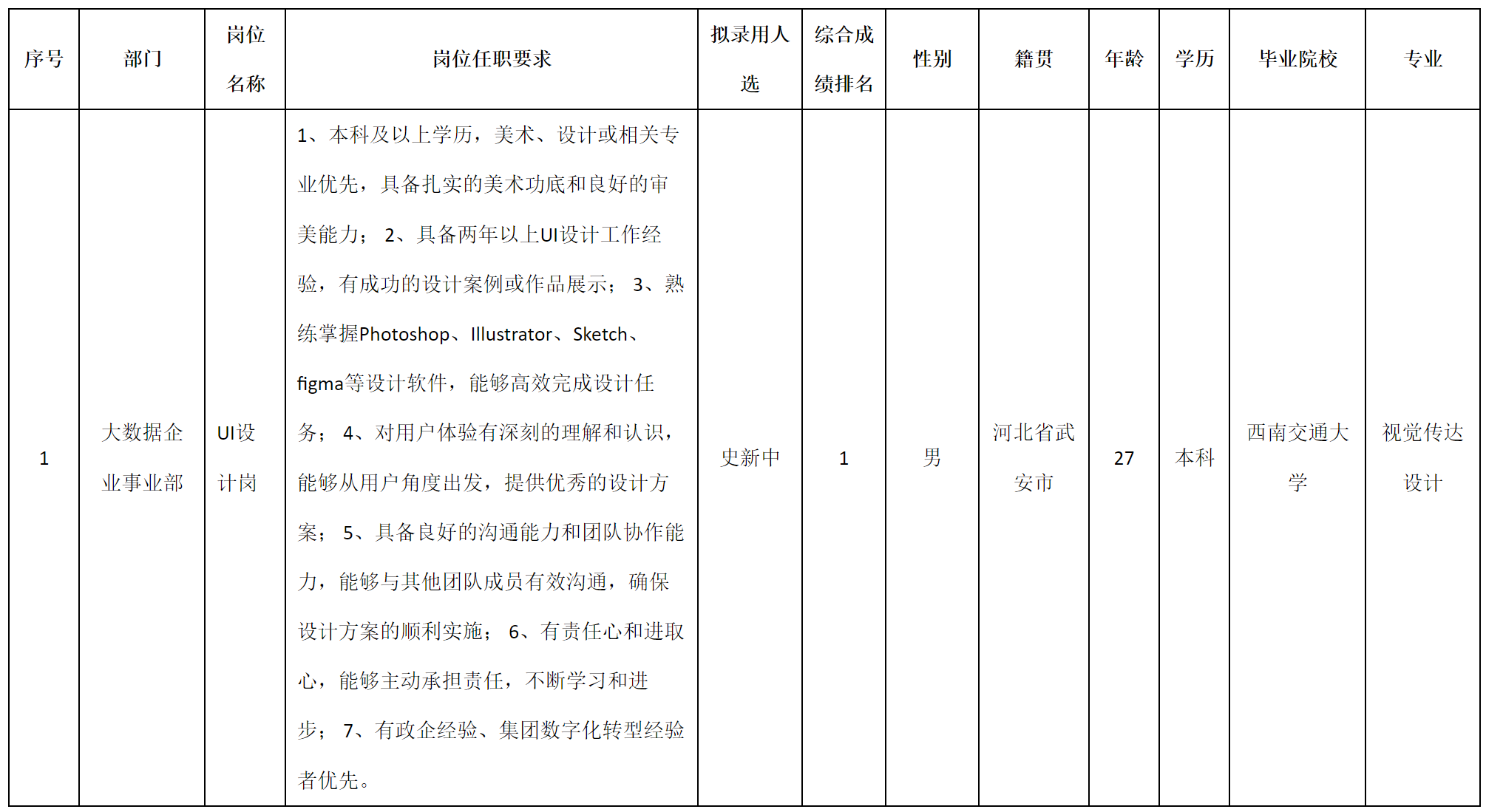 根據(jù)四川九州軟件有限公司發(fā)布的招聘公告及招聘相關(guān)規(guī)定,經(jīng)筆試、面試、考察、體檢等程序,擬錄用史新中同志到四川九州軟件有限公司工作,現(xiàn)予以公示,具體情況如下: