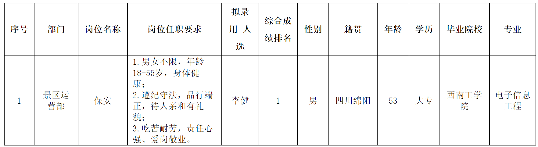 根據(jù)四川越王樓文化傳播有限公司發(fā)布的招聘公告及招聘相關(guān)規(guī)定,經(jīng)面試、體檢等程序,擬錄用李健同志到景區(qū)運(yùn)營部工作,現(xiàn)予以公示,具體情況如下: