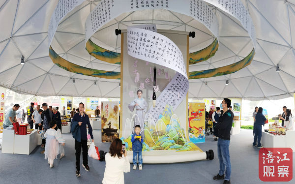 走進(jìn)此次活動(dòng)主題縣江油館,映入眼簾的是太白立體畫軸創(chuàng)意造型,畫軸以李白詩詞為屏,畫軸前方為立體的奇山異水造型,向杭州市民展示“蜀道太白鄉(xiāng),詩意棲居地”的浪漫江油。不少前來觀展的杭州市民,忍不住拿起手機(jī)與“李白”合影。