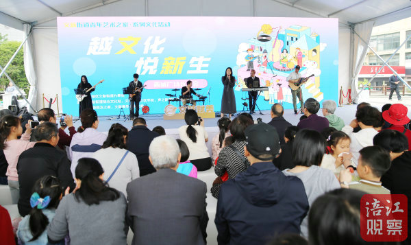 在展演區(qū),杭州市西湖區(qū)文新街道辦事處舉辦的廣場(chǎng)音樂會(huì)正在進(jìn)行中。來自杭州聲之韻青年藝術(shù)團(tuán)、高校校友之家的演員們,為現(xiàn)場(chǎng)觀眾帶來了一場(chǎng)“青春風(fēng)暴”。