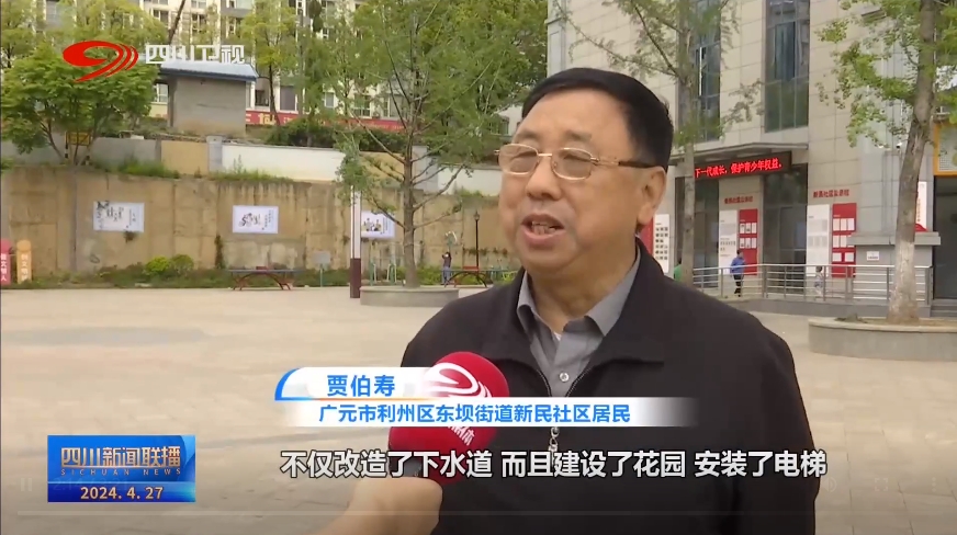 廣元市利州區(qū)東壩街道新民社區(qū)居民 賈伯壽:不僅改造了下水道,而且建設(shè)了花園,安裝了電梯,社區(qū)還建設(shè)了老年服務(wù)綜合體,現(xiàn)在的小區(qū)使我們老百姓住到舒適、開心、巴適。