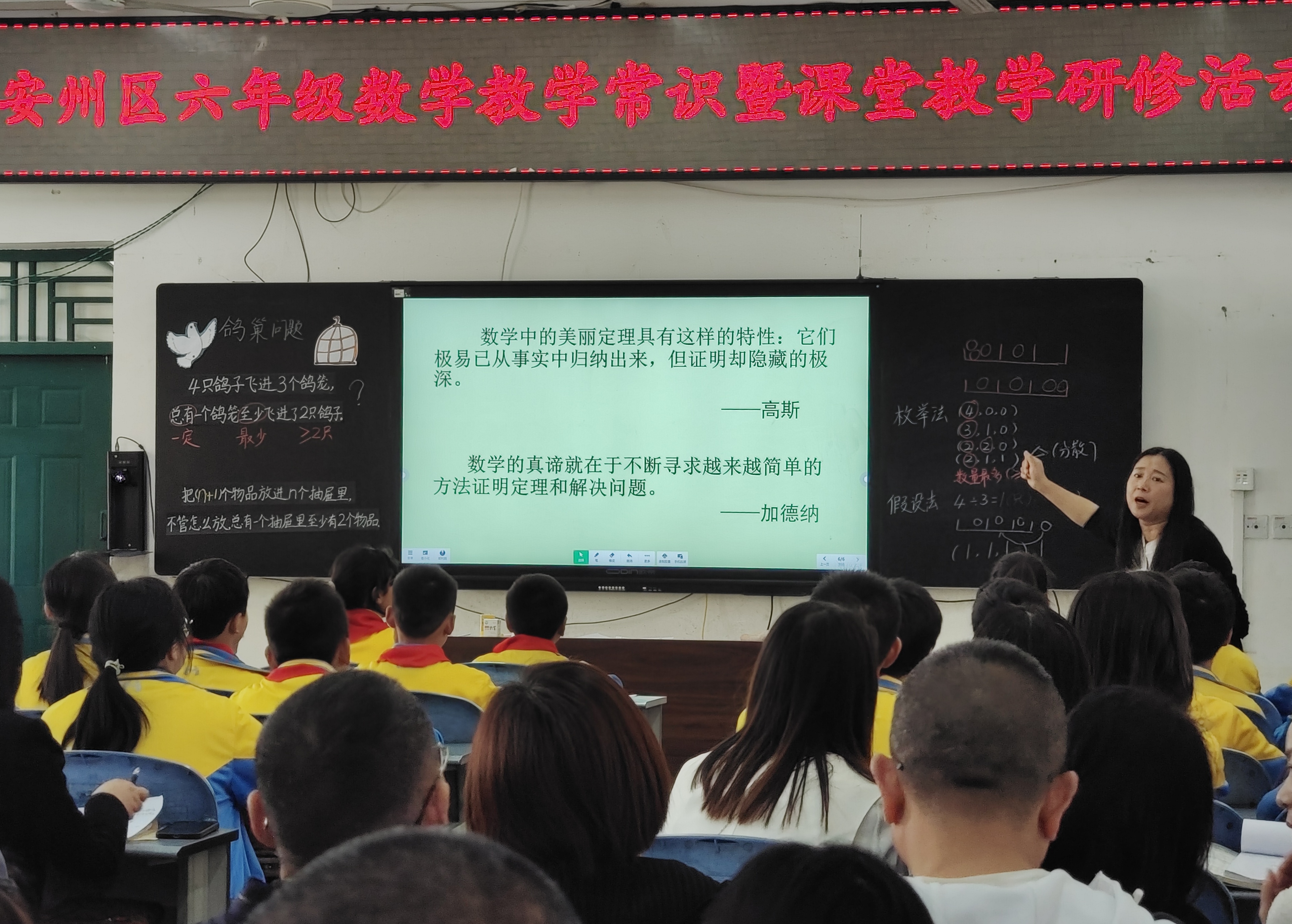 接著,來(lái)自沙汀實(shí)小的郭利娟老師執(zhí)教了《鴿巢問(wèn)題》一課。郭老師親和力十足,利用小游戲激發(fā)學(xué)生的學(xué)習(xí)興趣和求知欲,引導(dǎo)學(xué)生運(yùn)用枚舉法、假設(shè)法發(fā)現(xiàn)鴿巢問(wèn)題的原理。整堂課,郭老師把對(duì)教材的解讀有效落實(shí)在了每一個(gè)環(huán)節(jié)中,充分發(fā)揮了學(xué)生的主體作用,為學(xué)生提供了獨(dú)立思考、主動(dòng)探索的空間。