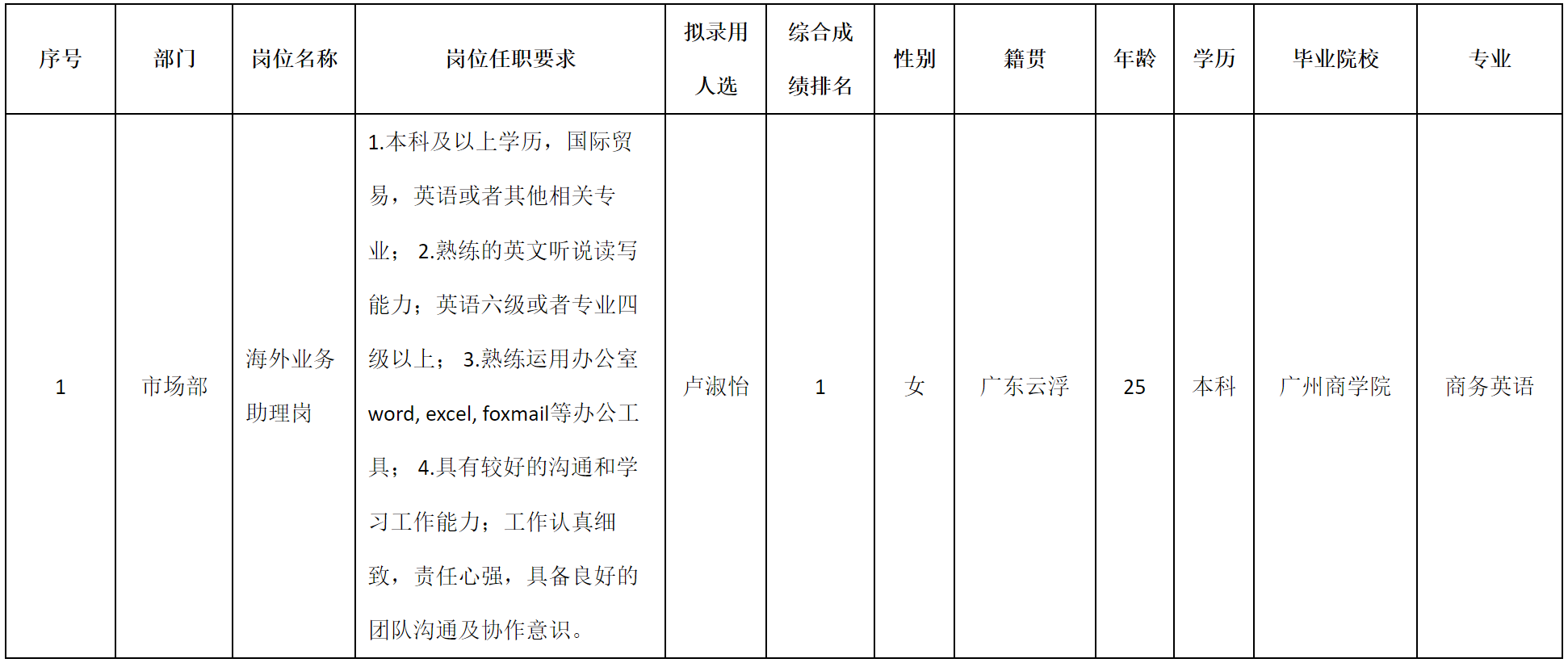 根據(jù)深圳市九州智和科技有限公司發(fā)布的招聘公告及招聘相關(guān)規(guī)定,經(jīng)筆試、面試、考察、體檢等程序,擬錄用盧淑怡同志到深圳市九州智和科技有限公司工作,現(xiàn)予以公示,具體情況如下: