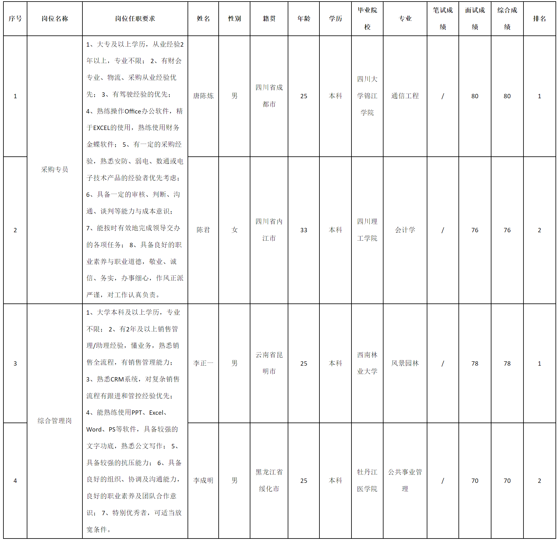 根據(jù)四川科瑞軟件有限責(zé)任公司發(fā)布的招聘公告及招聘相關(guān)規(guī)定,經(jīng)筆試、面試等程序,現(xiàn)將筆試(面試)成績予以公示。