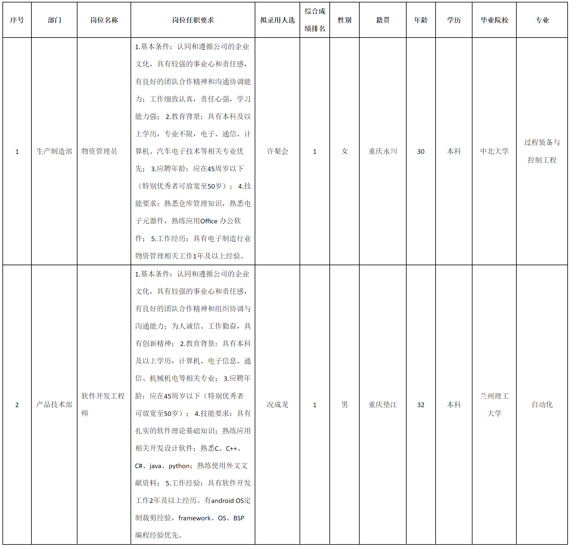根據(jù)重慶九州隆瓴科技有限公司發(fā)布的招聘公告及招聘相關(guān)規(guī)定,經(jīng)筆試、面試、考察、體檢等程序,擬錄用況成龍,許梨會同志到重慶九州隆瓴科技有限公司工作,現(xiàn)予以公示,具體情況如下: