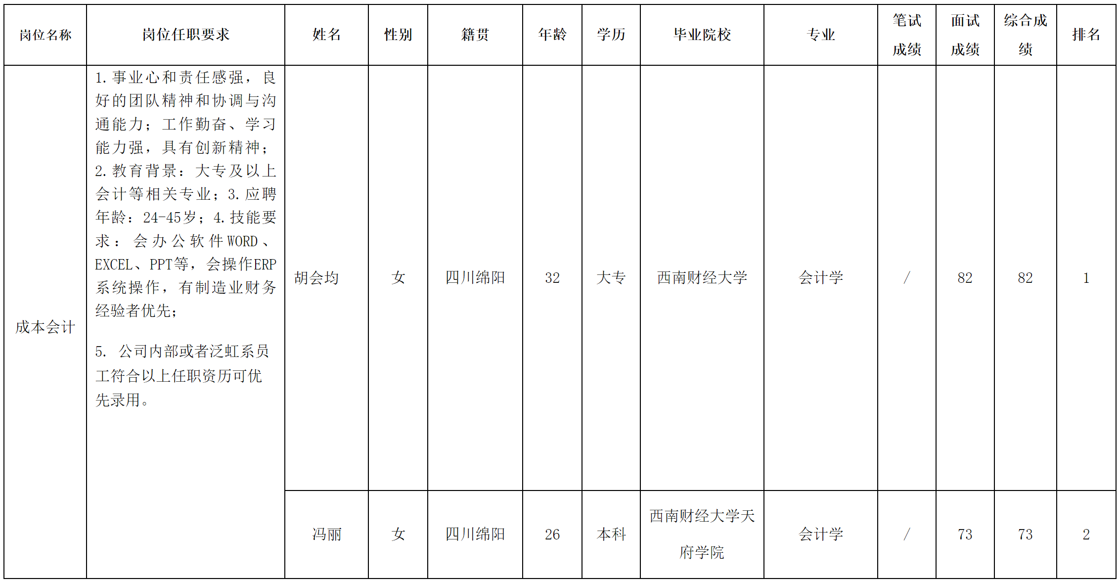 根據(jù)四川愛創(chuàng)科技有限公司發(fā)布的招聘公告及招聘相關(guān)規(guī)定,經(jīng)面試等程序,現(xiàn)將面試成績予以公示。