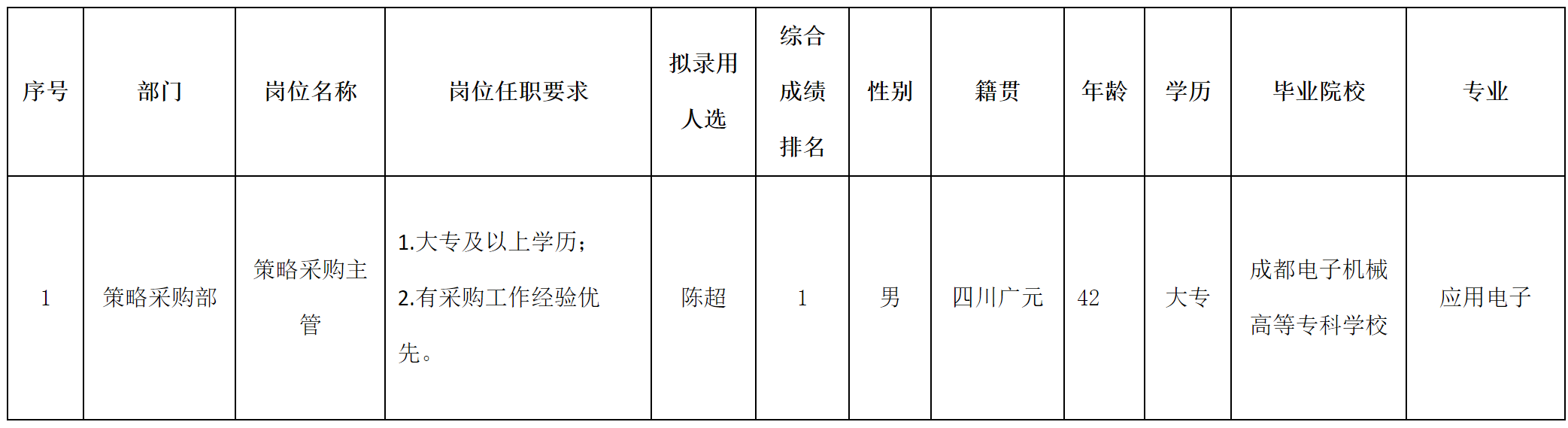 根據(jù)四川愛(ài)聯(lián)科技股份有限公司發(fā)布的招聘公告及招聘相關(guān)規(guī)定,經(jīng)面試、考察、體檢等程序,擬錄用陳超同志到策略采購(gòu)部工作,現(xiàn)予以公示,具體情況如下: